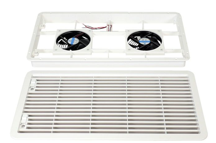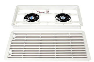 This 12v double fan vent is used to reduce heat build-up behind your fridge and improve its cooling performance.